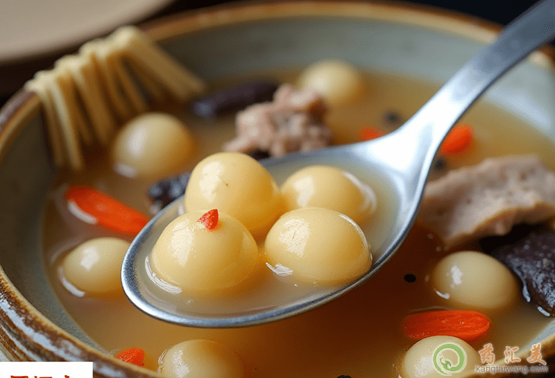 3、鍋上火,加入高湯,燒開后勾玻璃芡,將拌好的烏龜?shù)暗谷胲蜏佒校瑹_后,淋香油,撒上香菜、胡椒粉即成。香菜、胡椒粉亦可不入鍋,上桌時裝味碟備用。